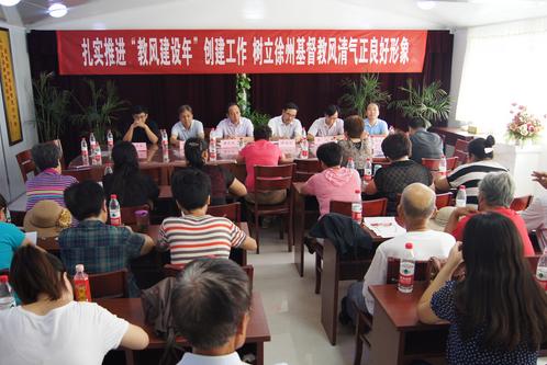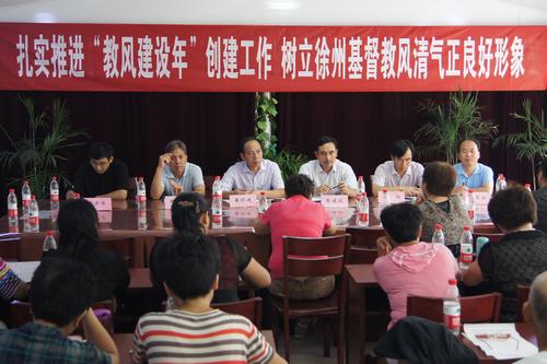 江苏省徐州市基督教两会于2013年8月28日在云龙区基督教恩溢堂召开以《扎实推进“教风建设年”创建工作 树立徐州基督教风清气正良好形象》为主题的推进“教风建设年”创建工作会议。市区各堂点负责人、神学毕业生和专职教牧人员四十余人参加了会议。