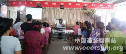2013年9月6日和8日,风和日丽,在云南省德宏傣族、景颇族自治州盈江县盏西大田坝教堂和平镇教堂,云南省基督教两会《景颇文圣经》二次印刷发行仪式暨感恩礼拜分别在这里举行,全县教牧同工、信徒800多人参加。