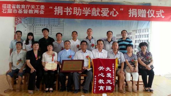 2013年9月17日下午,石狮市基督教两会长老、牧师一行8人,在福建省基督教三自会副主席、石狮市基督教三自会主席蔡自力长老的带领下,风尘仆仆地来到平和县第三中学(峡寨镇)开展“捐书助学”活动。平和县第三中学属于贫困区,图书馆简陋,存书寥寥无几,直接影响着学生的课外学习。在福建省教育厅关工委的牵线搭桥下,石狮市基督教妇女事工把今年“三、八”节活动的3.7万元购买课外书籍,做为中秋节的礼物,捐助给平和县第三中学,以期提高学生的学习视野和综合成绩,多掌握一些科学知识。