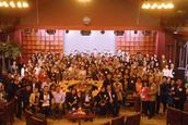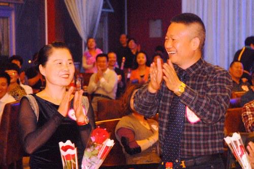 10月12日晚,北京丰台堂夫妻团契举行了周年感恩晚宴,逾七十对夫妻到场参加。夫妻团契为大家献上了舞蹈和话剧,夫妻们围坐在摆设有水果、玫瑰花和情人蜡烛的桌子周围,看着“存款”、“读情书”、“见证恩典”等夫妻营会中的环节在舞台上再现,重温了在营会中的感动。