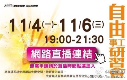 11月6日下午,约书亚音乐事工在新浪微博发布消息说2013年自由事工研习会今晚将有在线直播,时间为晚上19:00到21:30,直播地址为http://t.cn/zROjIVn。