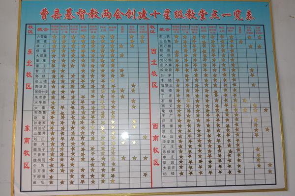 现在曹县60个教会里面,10个星的教会有2个,以8、9个星的教会为多,6个星的教会就很少了。使用这种管理方式之后,不仅方便了教会的管理,而且有人想了解教会的情况的话,也可以更容易做出选择。
