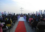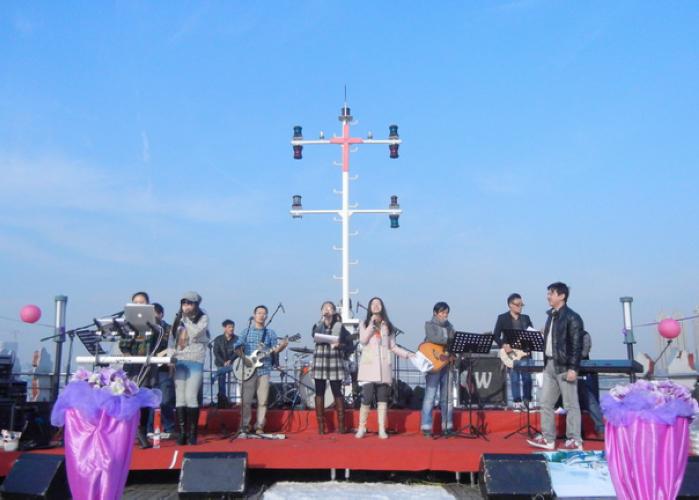 但神给了好天气,活动如愿在游轮的露天甲板上举行,整个游轮被装饰得十分漂亮,红红的十字架高高挂在船头桅杆上异常醒目。下午两点,游轮准时开船去迎接赶来参加这次活动的人们,这场加上福音音乐会的别样婚礼,除新人亲友外,还吸引了不少基督徒携亲朋好友前来参加,这其中还有一些是从外地慕名而来的,很快,游轮甲板上就座无虚席。