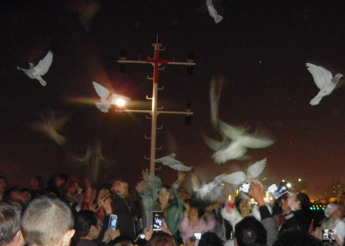 音乐会后有姊妹分享了她对这一部分的感受:当唱到《求你临到这地》时,小提琴悠扬的琴声在耳边响起,江风吹抚着自己的身体,闭着眼睛安静在神面前吟唱,真的很美,唱到高潮处,睁开眼睛看到的就是广阔的蓝天,而始终在前头高挂的红色十字架镶嵌在这天蓝的背景中,十分美丽,不由自主就想到那《圣经》中所记载的玻璃海,这敬拜是否和玻璃海上的敬拜相似?