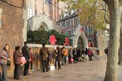 沐恩堂24日平安夜圣乐崇拜晚上七点钟开始。下午三点钟,就有近五十人在教堂门口排起了长队。问问门口等候的第一人:两点钟就来排队了。
