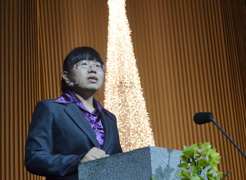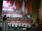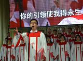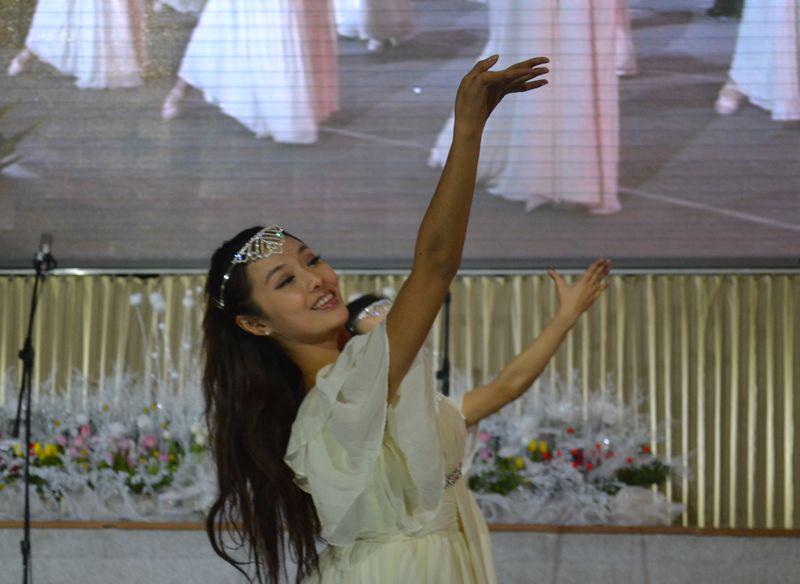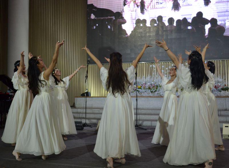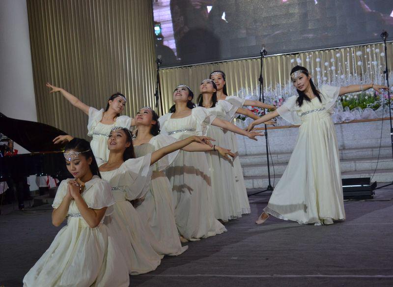 8位姊妹身着白色裙装走到台上,以优美的音乐、翩翩的舞姿、灿烂的笑容描绘着上帝的崇高和伟大。她们时而一前一后做着轻柔的动作,时而四人一组组成两个圆形,后来则双手高举、八人聚集成一个大大的圆圈,似乎要将所有的颂赞和荣耀都归给在天上垂顾我们的上帝。最后,突然阵型一变,一个白色的十字架出现在讲台之上,引起人们阵阵掌声。