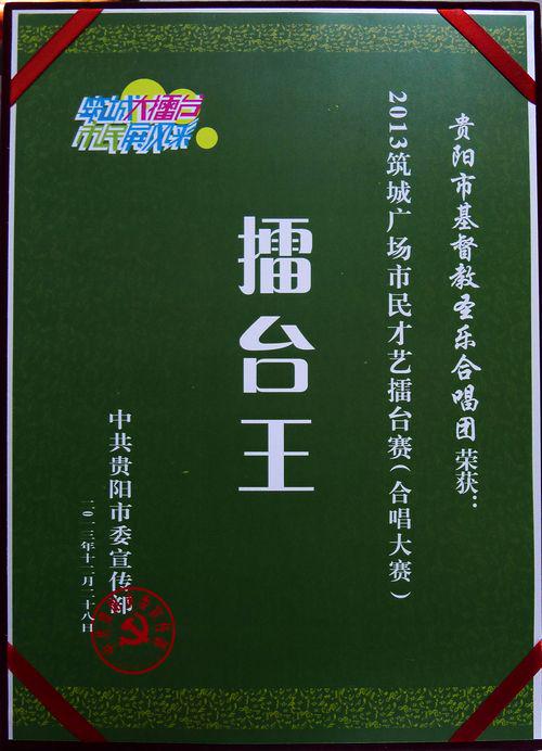 2013年12月30日,“2013年贵阳市广场系列文化活动汇报展演暨颁奖”在贵阳演艺集团星光剧场举行,该活动由中共贵阳市委宣传部主办,贵阳市文化广播电影电视局、贵阳日报传媒集团、贵阳广播电视台承办、贵阳市群众艺术馆执办,贵阳市基督教圣乐合唱团参加了“市民才艺擂台赛”,荣获合唱决赛“擂台王”。