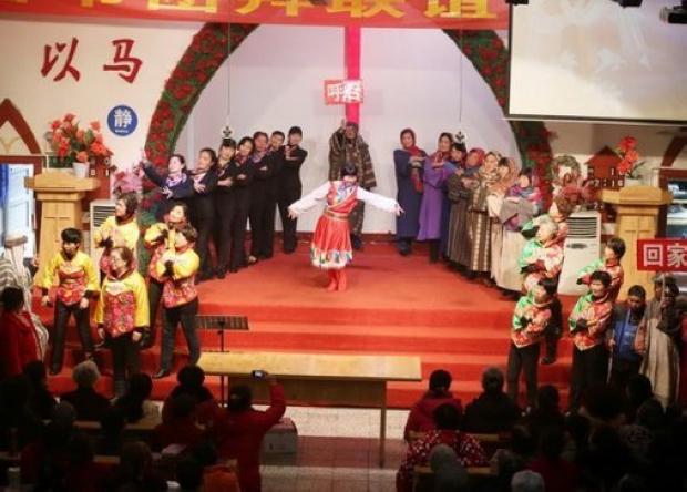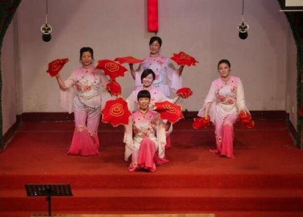 团拜会从上午9点30开始,11点30结束,两个小时的时间,安排了多种多样又精彩纷呈的节目。有秧歌舞、圣经知识猜谜、击鼓传花、现场摸奖,还有小品、双簧、诗朗诵、剪纸、舞台剧等表演,以及包括廖智见证在内的几段视频。