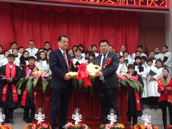 长乐市基督教爱国会主席游珍牧师代表嘉宾致辞、范小青姐妹宣读县委书记梁奕章、市民宗局等领导及全省各地的教会、堂点分别发来的贺电、贺词。最后,典礼在牧师团的祝福中结束。