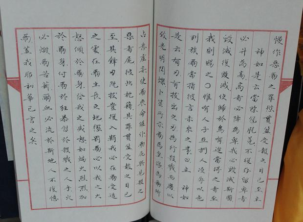 2014年1月,历时17个月,如今62岁的吕老师以毛笔小楷抄完了繁体字的圣经。“在时间上,这是(迄今为止)最快的速度了”,苏辉弟兄说。