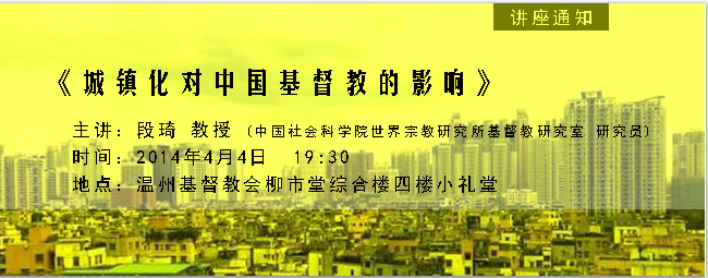 2014年4月4日,中国社会科学院段琦教授将在温州基督教会柳市堂,进行题为《城镇化对中国基督教的影响》的讲座。
