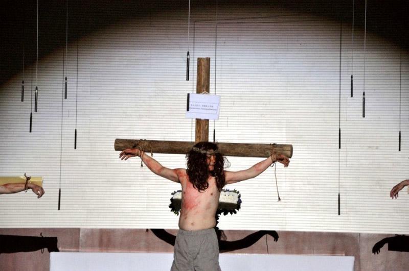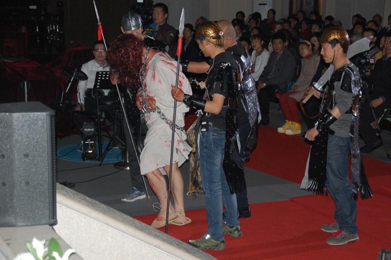 为达到情景再现的效果,圣剧的负责人员精心准备道具、服装等,期中服装是有一位姐妹花费1个多月的时间亲手缝制的,所有参演人员也精心扮演,特别感谢耶稣的扮演者--甘宏达弟兄付出!甘弟兄在长达近一个小时的时间里被剥去外衣“赤身裸体”,尤其是现场的道具—十字架是实实在在的原木及铁链都承重无比;皮鞭、脚踢等刑罚情节大部分是结实打在身上。