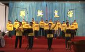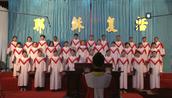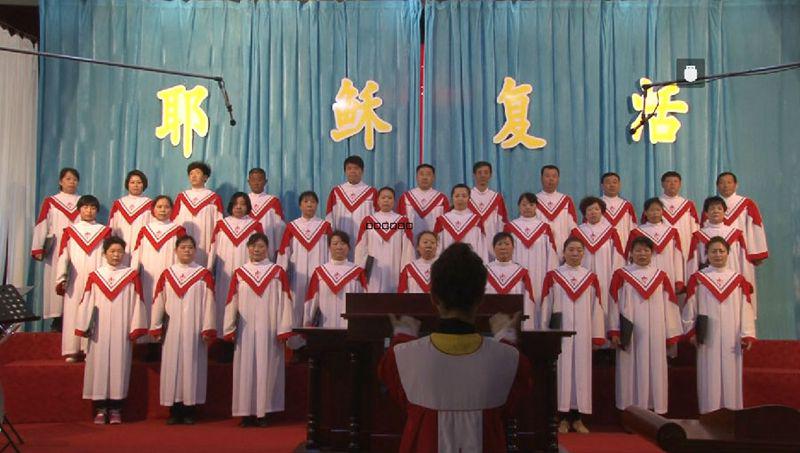 而30几位诗班成员,穿着配有红色印边的洁白唱诗服也发出赞美的歌声,用优美的曲调将他们身后“耶稣复活”四个金色大字描绘在前来参加聚会的弟兄姊妹们眼前。