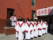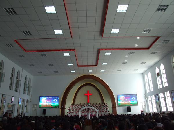 上午九点,一楼主堂座无虚席,联合崇拜赞美正式开始 。首先由中山路基督教堂圣诗班献上了《贺他为王》、《谷中百合花》,随后由通顺街基督教堂圣诗班献上了《道成肉身》、《真光导引》。