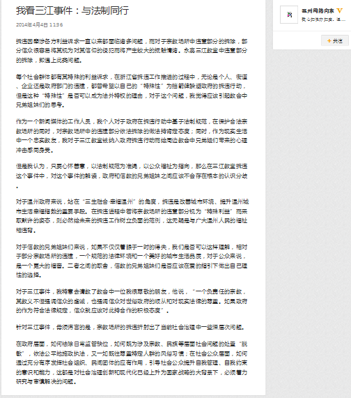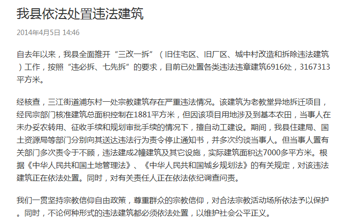 回顾三江教堂被拆除的法律依据,要从永嘉县发布的官方微博说起。2014年4月5日14:46分,新浪微博“永嘉外宣”发表《我县依法处置违法建筑》一文,文章称:自去年以来,永嘉县全面推开“三改一拆”(旧住宅区、旧厂区、城中村改造和拆除违法建筑)工作,按照“违必拆、七先拆”的要求,目前已处置各类违法违章建筑6916处,3167313平方米。