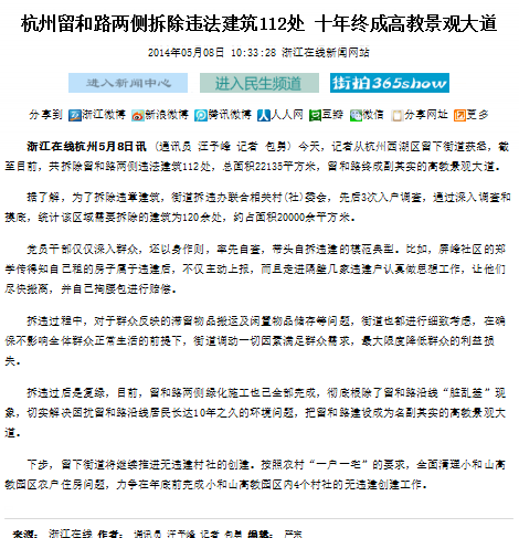 除了宗教建筑,其他违章建筑被依法拆除的也不少,就在昨日(5月8日)上午10点半左右,杭州在线文章《杭州留和路两侧拆除违法建筑112处,十年终成高教景观大道》报道:截至目前,共拆除留和路两侧违法建筑112处,总面积22135平方米,留和路终成副其实的高教景观大道。
