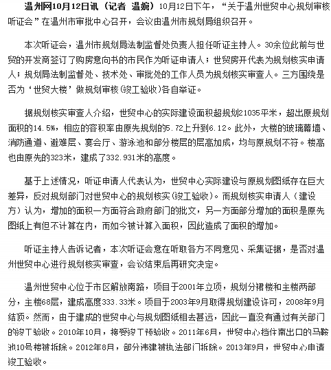 另一个案例是温州世贸中心大厦,存在违建却可以整改和补办手续。333.33米高、为“浙江第一高楼”的温州世贸中心大厦,最初预计在2008年底竣工,然而这座温州的地标性建筑,一建就是11年,当时的投资超过20亿。据温州网报道,世贸中心的实际建设面积超规划21035平米,超出原规划面积的14.5%,相应的容积率由原先规划的5.72上升到6.12。此外,大楼的玻璃幕墙、消防通道、避难层、宴会厅、游泳池和部分楼层的层高加成,均与原规划不符。楼高也由原先的323米,建成了332.931米的高度。(http://news.66wz.com/system/2013/10/12/103836367.shtm)2011年6月,世贸中心挡住南出口的马鞍池10号楼被拆除。2012年8月,部分违建被执法部门拆除。2013年9月,世贸中心申请竣工验收。