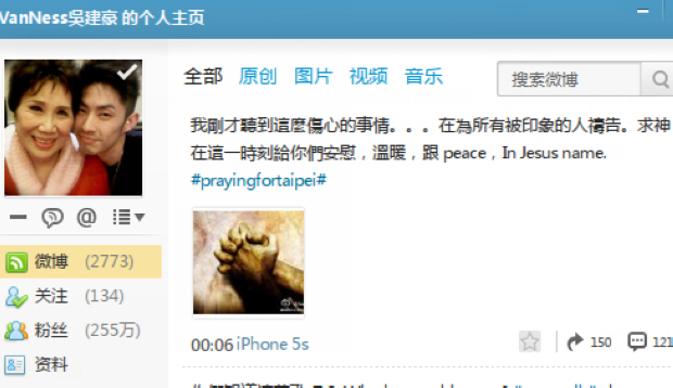 “Pray for taiwan/taipei(为台湾/台北祈祷)”,听闻消息,吴建豪和陈威全在微博中表示心痛并写下为台湾祈祷。另外,吴建豪表示“在为所有被印象(影响)的人祷告。求神在这一时刻给你们安慰,温暖,跟 peace(平安),In Jesus name(奉主的名祷告)!”陈威全也祝大家外出平安。