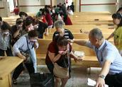 另一个防灾演习项目是反对暴恐,假设某聚会日,突然有一暴恐分子,手拿菜刀,从大门处走进并舞动菜刀乱砍聚会人员,门前接待组的人员该如何面对。