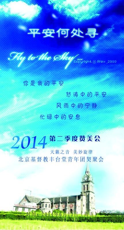 2014年6月13日晚,北京市基督教丰台堂青年聚会将举办第二季度赞美会,此次赞美会主题为“平安何处寻”,届时将由敬拜组引领敬拜,牧者展开精彩的分享,弟兄姐妹一同为他人代祷等。