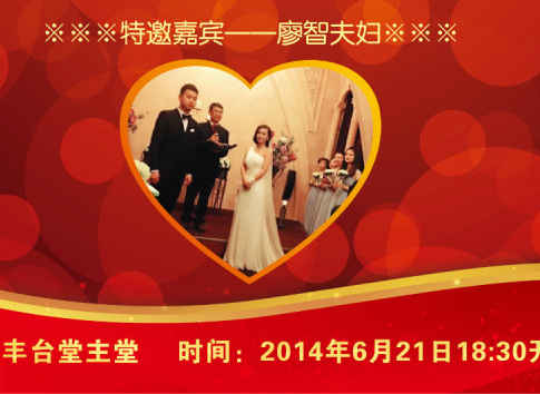 6月21日(周六)晚6:30-9:00,北京丰台堂夫妻团契将在丰台堂主堂举行团契两周年庆,届时,廖智夫妇作为嘉宾受邀参加。
