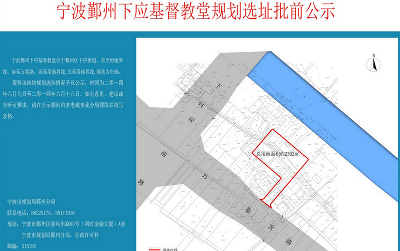 根据宁波规划局鄞州分局6月9日的选址批前公示,鄞州下应基督教堂新堂地址位于鄞州区下应街道,教堂规划用地总面积为2392平方米,规划建筑面积是3300平方米。