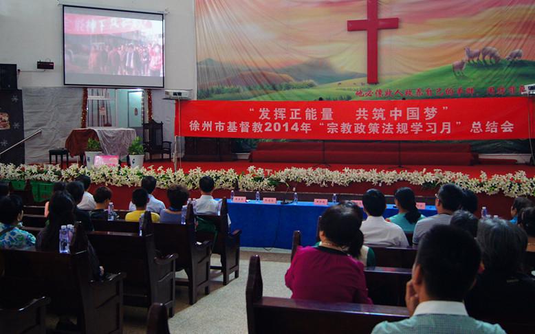 2014年6月27日上午徐州市基督教两会在淮海西路基督教会崇真堂召开以“发挥正能量、共筑中国梦”为主题的“宗教法规学习月”总结会。徐州市基督教办公会成员和市区各堂点负责人和全体神学毕业生约40人参加了会议。