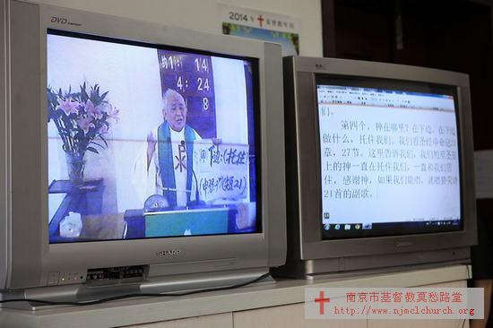 四楼会场中有两台电视机,一台电视显示主会场的礼拜过程,另一台电视连接速录员电脑,及时显示速录员所记录的牧师讲道内容,通过这两台电视,聋哑人信徒可以通过观看的方式进行正常礼拜。