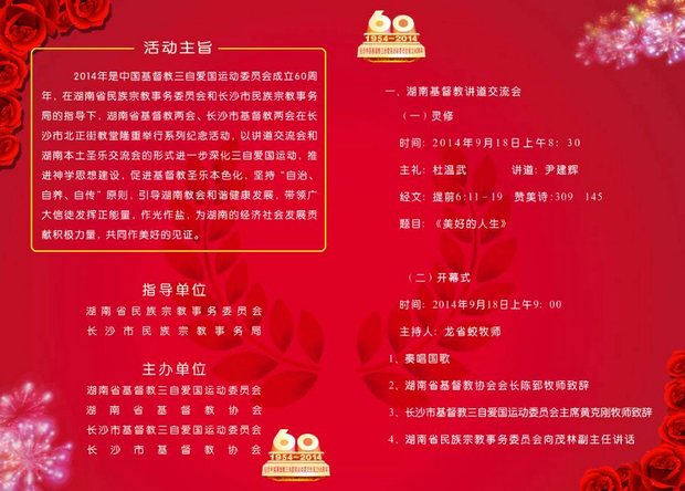 为纪念中国基督教三自爱国运动会成立60周年,湖南省基督教两会、长沙市基督教两会计划于9月17日到19日于长沙北正街教堂举行系列活动,内容包括讲道交流会和湖南本土圣乐交流会。