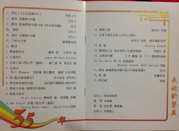 9月24日(周三)晚七点,北京基督教会崇文门堂将举办纪念大圣诗班成立35周年“永远的赞美”圣乐崇拜会。现在,崇拜会的节目单已经制作出来了,想要参加的人可以先了解一下。
