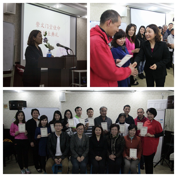 崇文门堂“使命班”举行结业典礼(图:崇文门堂网站;本站编辑:李慕博)10月20日,北京崇文门堂使命班举行了结业典礼,4个班48人顺利结业。使命班在2013年3月份开课,期间学习的时间超过8个月,学完了一套四本教材《塑造主生命》。
