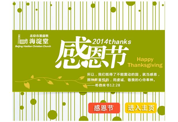 海淀堂网站感恩节专题选用希伯来书12章28节为主题经文:“所以,我们既得了不能震动的国,就当感恩,照神所喜悦的,用虔诚、敬畏的信侍奉神。”