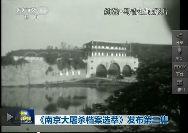 12月9日,央视《新闻联播》在播报国家档案局发布《南京大屠杀档案选粹》第三集时,播放了部分由美国牧师约翰·马吉所拍摄的南京大屠杀实景电影,这是1937年他担任国际红十字会南京委员会主席时冒着生命危险偷偷拍摄的。