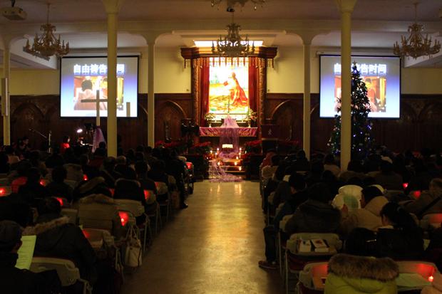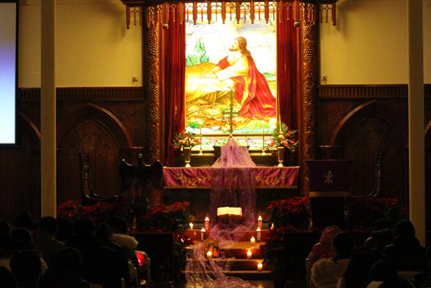 礼拜堂圣台最前面是明亮的耶稣在客西马尼园祈祷的图像,前台最中心处是十字架,十字架周围摆满了蜡烛。当晚七点半,年轻的基督徒们每人手持蜡烛,正式开始了这一教会史上传承了七十多年的祈祷程序。