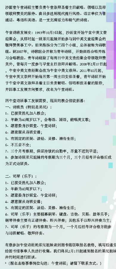 具体招募信息及沙面堂午堂诗班情况、历史请见下图海报: