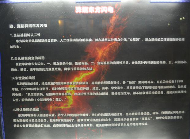 继通过教会宣传栏向会众揭示邪教“新天地教会”后,近日,北京缸瓦市堂又向会众揭示异端“东方闪电”的情况。文中讲到了“东方闪电”的起源、拉人的方法、异端书籍,指出了其偏离真理的错谬之处。