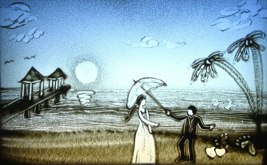 此外,沙画中还创意模仿二人之前晒出的王祖蓝为李亚男撑伞等婚纱照,而两人曾甜蜜献唱的《好好恋爱》也贯穿始终。
