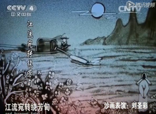 3月9日,“圣彩沙画”将基督徒沙画师刘圣彩在CCTV4《快乐汉语》中的作品《春江花月夜》上传到了腾讯视频网。伴着中国古典乐和《春江花月夜》诗朗诵,“明月”“小舟”“凉亭”等景物以沙画形式一一出现。