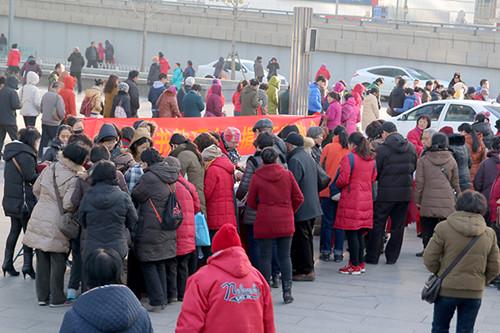 在海淀堂广场上,红色条幅上醒目地写着黄色大字,告诉信徒们此次义卖的宗旨。义卖所得款项将捐赠给云南教会。