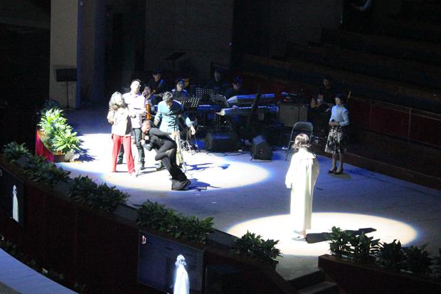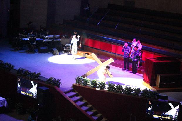 聚会进入第二幕,青年义工演唱《飞翔》、《你是我永远的救主》;与此同时进行的,是流着血、背负十字架的耶稣的扮演者,他从台下蹒跚地走来,走上了高处,被钉死、消失在人们的视线中。在歌曲的高潮之后,他重新出现,身着明亮的白色的衣服,走向正在被魔鬼捆锁和牵引着的三个青年人。这时,魔鬼稍作挣扎之后倒下了,他解开了那三个青年身上的“锁链”。他们一起激动地欢呼。
