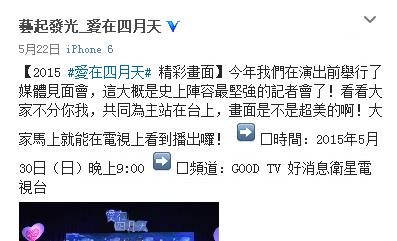 如果你曾因无缘观看完整版2015年爱在四月天而惋惜,那么机会来了。据“艺起发光_爱在四月天”新浪官微22日消息,2015爱在四月天精彩画面将于5月30日晚21:00通过GOODTV好消息卫卫星电视台直播。