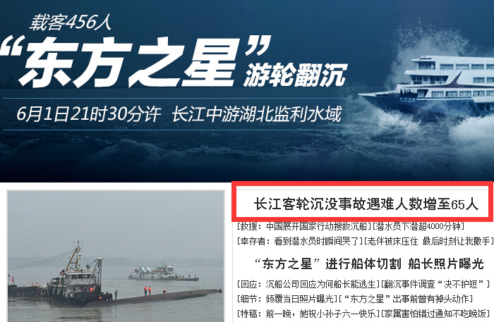 6月3日晚,东方之星沉船事故现场的搜救彻夜未停。3日晚21点到4日早晨8点,现场新发现39具遇难者遗体,遇难人数升至65人。