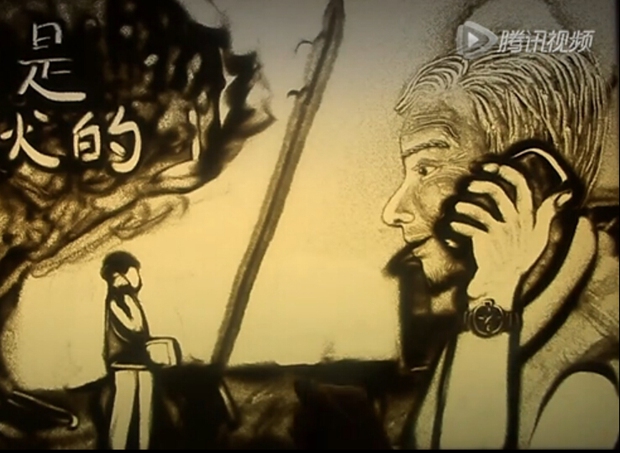 在这个3分钟沙画的起头是父亲拿着奶瓶给儿子喂奶,随着时间的过去,逐渐出现父亲背着儿子、骑车带着儿子以及一家人吃饭的场景,最后是老父亲跟儿子通电话的画面。