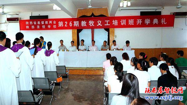 2015年9月7日,陕西省基督两会、省圣经学校第二十六期教牧义工培训班开学典礼在学校四楼礼堂举行,全体师生150多人参加。省基督教两会主席、会长王俊牧师、副主席、副会长、秘书长(代)韦乐民同工、省基督教协会总干事李世峥牧师、省宗教局人事处海建宇副处长,省宗教局人事处干部杨威,省宗教局二处干部齐谦等出席了会议。省基督教两会副主席、副会长、圣经学校副校长陈鼎亮牧师主持了典礼。