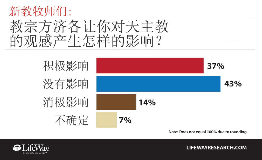 43%的新教牧师认为,教宗方济各没有改变他们对天主教的观感。但是,超过一半的新教牧师认为,教宗方济各影响了他们对天主教的观感——其中积极影响(37%)比消极影响(14%)多了几乎3倍。