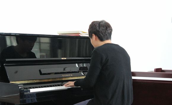 (今年20岁的学员王天佑弟兄在练琴 图:基督教华语音乐网)