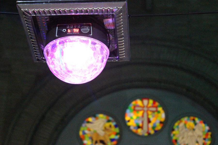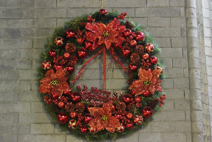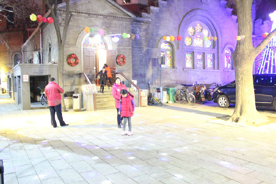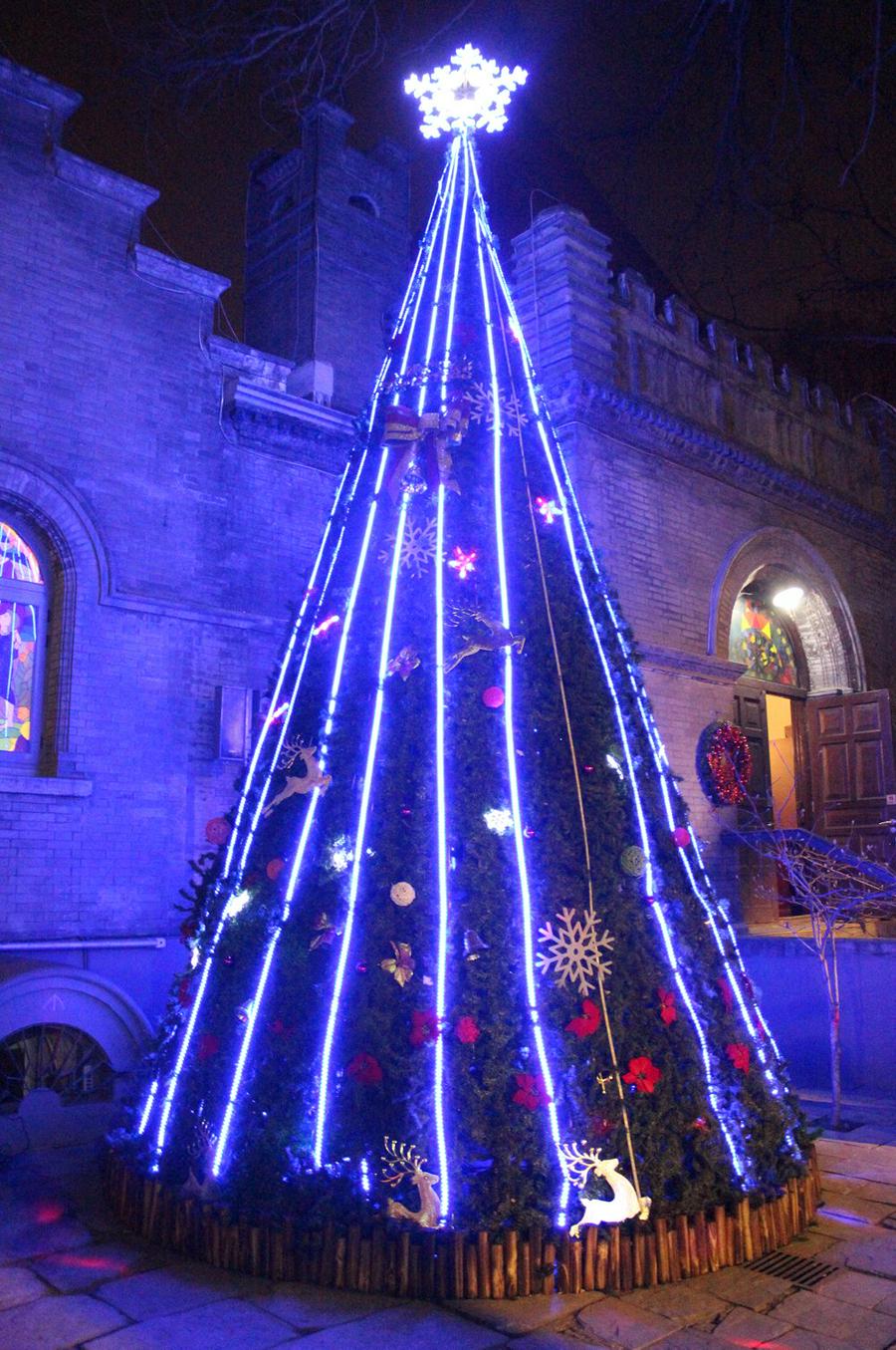 纪念耶稣降生的圣诞节马上就要到了,北京崇文门堂已经穿上了“圣诞装”。崇文门堂的院中挂起舞台灯,在地上照出大大小小的彩色圆圈;墙上的小舞台灯发出色彩斑斓的光;4米高左右的圣诞树披着一条条变换颜色的彩灯,树上装扮着雪花、跳跃的小鹿等饰物,树顶是发光的大卫之星;教堂的外墙和教堂内多处挂着降临圈;教堂内的挂灯下悬挂着铃铛和彩球。