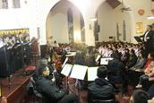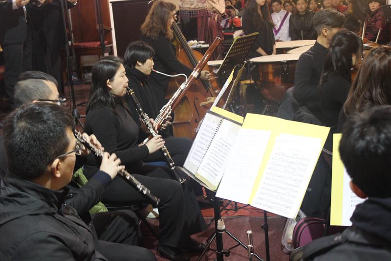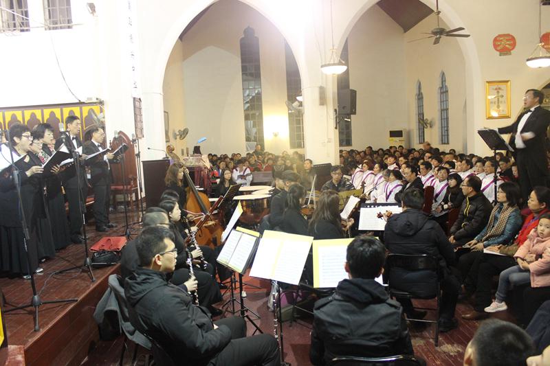 12日上午刚举行过国家公祭日和平祈祷崇拜的莫愁路堂,还没来得及拉下白色条幅,就又于当晚迎来了一场圣乐崇拜,奏响了圣诞之音。此次音乐会主题为“在至高之处,荣耀归与神”,受江苏省基督教两会邀请,由加拿大卡城华人圣乐团、江桦合唱团、多伦多联合诗班及香港圣乐团团员与管弦乐团联合演出,作品包括:贝多芬C大调弥撒曲、莫扎特C小调弥撒曲和亨德尔弥赛亚神曲等。