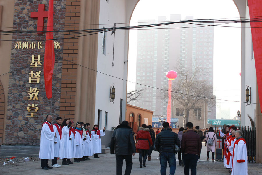 长江路基督教堂始建于1998年,位于大学路与长江路西南方,同时也是郑州市基督教两会神学培训中心所在地。长江路教堂因城市道路建设,于2013年10月2日拆迁,在原址略向东迁移旧地重建,重建后教堂及周边设施一共占地由拆迁前的5.3亩扩大到8亩。图为郑州长江路教堂献堂祝圣典礼即将开始,教会服侍人员在教堂大门口欢迎弟兄姐妹们(图:福音时报)
