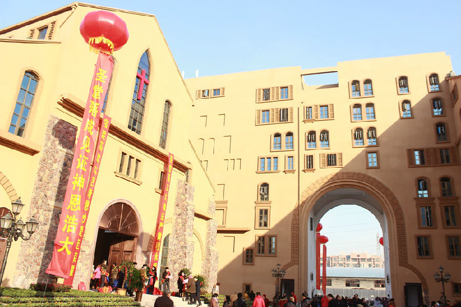 长江路教堂总建筑面积(包括外围建筑)为14,500平米,教堂建筑面积2,265.9平方米,高20.6米,长42米,宽25米,能容纳约2,300人同时聚会,是目前郑州市最为雄伟的教堂。图为弟兄姐妹们走进教堂(图:福音时报)